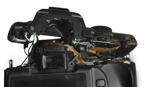 Nach der Entfernung der Schrauben kann die obere Abdeckung etwas angehoben (nicht entfernt!) werden. Wegen der Drähte und Flachkabel, welche die elektronischen Elemente unterhalb der Gehäuseabdeckung und dem restlichen Kamerakörper verbinden, muss dieses vorsichtig und ruhig erfolgen.
