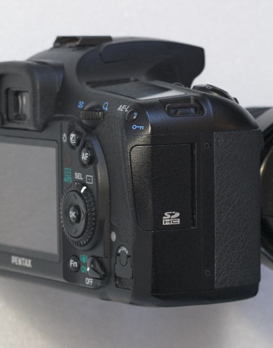 Um die Klappe vor dem Speicherkartenschacht zu öffnen, muss sie über eine Vorrichtung auf der Rückseite der Kamera entriegelt werden. Dieser aufwendige Mechanismus wurde beim Nachfolger, der Pentax K-7 aufgegeben. Die K20D hat einen Ein- und Aus-Schalter für die Anti-Shake Funktion. Der ist sehr praktisch, weil man dafür nicht im Menue suchen und klicken muss.