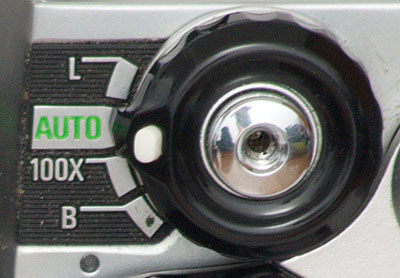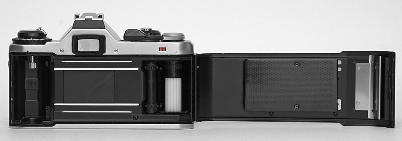 Das Filmfach der Kamera stellt niemanden vor große Rätsel. Die Rückspulkurbel ist nach oben ein Stück heraus zu ziehen, um die Filmpatrone einlegen oder entnehmen zu können. Gleichzeitig ist die Kurbel auch die Verriegelung der Rückwand. Um sie zu öffnen, muss die Rückspulkurbel nach oben gezogen werden.
