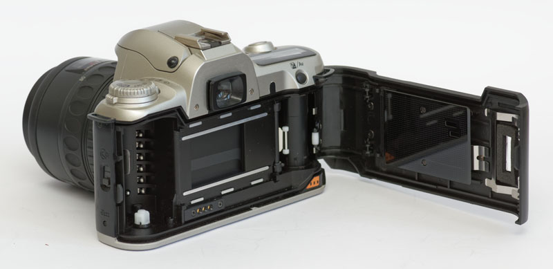 Pentax MZ-50. Rückseite mit geöffneter Rückwand. Man sieht die Abtaster für die DX-Codierung, den Lamellenverschluss und die Aufwickelspule für belichteten Film. Die Einfädlung ist Einlegen eines neuen Films ist sehr einfach.