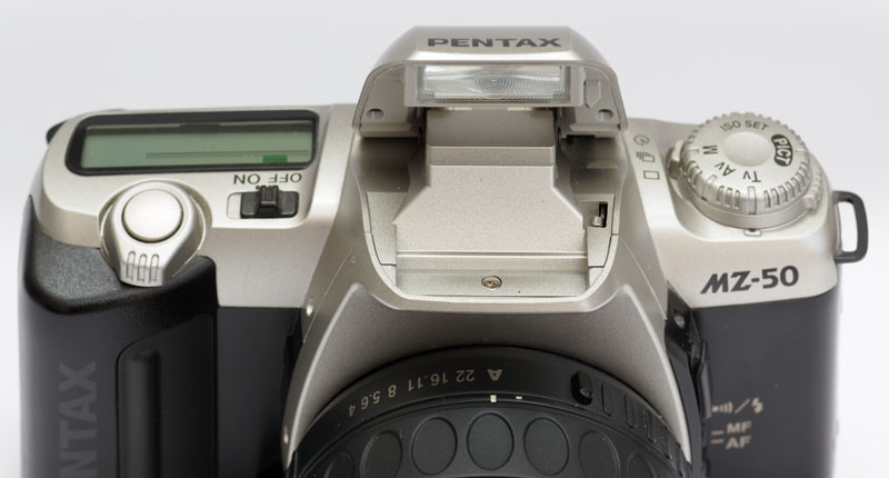 Die Pentax MZ-50 hat einen ausklappbaren Blitz und einen integrierten Motor zum Transport des Films und zum Spannen des Verschlusses.