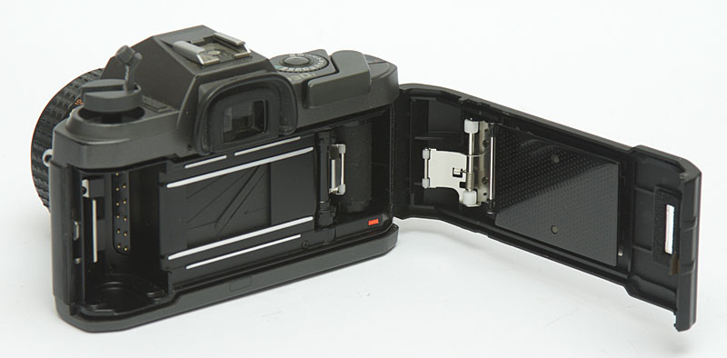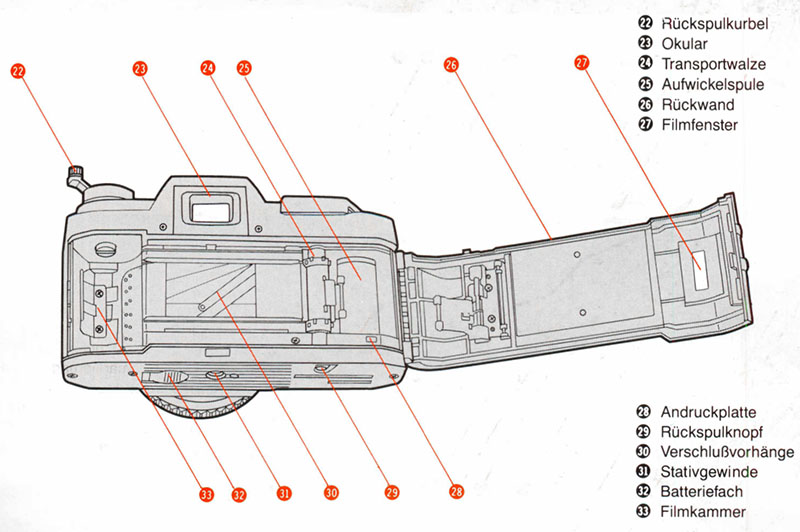Die Rückseite wird geöffnet durch das nach oben Ziehen der Rückspulenkurbel für den Film. Im Bild ist erkennbar, dass sie nach oben gerichtet ist und der zu ihr gehörende runde Teller auch etwas angehoben ist. Dadurch wird der Verschluss der Rückklappe entriegelt. In die linke Vertiefung wird die Filmpatrone eingelegt. Auf der rechten Seite gibt es eine runde Walze, zu der der Filmanfang gezogen wird und ein kleines Stück in den Spalt zwischen Walze und Innenwand geschoben wird. Durch das Schließen der Klappe nach dem Einlegen des neuen Films, sorgt ein Mechanismus dafür, dass er beim Transport um die Walze gewickelt wird und gleichzeitig aus der Filmpatrone gezogen wird. Um sicher zu sein, dass das funktioniert, vergewissert man sich beim mehrmaligen Spannen und Auslösen bis zur Anzeige der Zahl 1 auf dem Bildzählwerk, dass die Rückspielkurbel mit dreht.