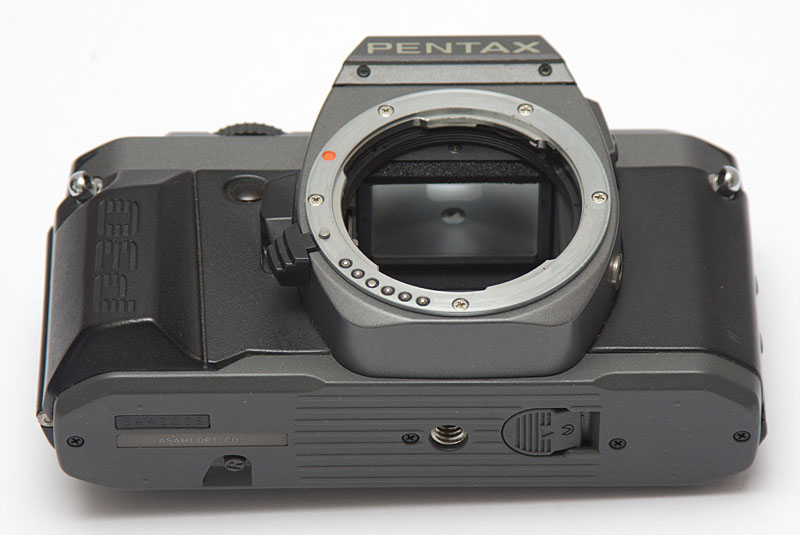 Bei diesem Modell hat Pentax auf der Unterseite auf den runden, abschraubbaren Deckel für das Batteriefach verzichtet und eine Klappe aus Kunststoff angebracht. Damals war das Vertrauen in Plastik noch nicht so groß wie später und man verwendete anfangs auch nicht immer haltbare Materialien, aber das neue System an der P-Serie funktionierte und so eine Klappe muss der Lebenszeit einer solchen Kamera ohnehin kaum mehr als 20 mal geöffnet und wieder geschlossen werden. Außerdem konnte man die Klappe am Scharnier nicht verlieren, während die kleine abbaubare Scheibe, die bei anderen Modellen den Verschluss des Batterieschachts bildet, schon mal aus der Hand fallen konnte und sich aus dem Staub machte.