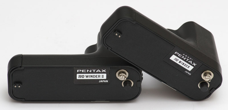 Es gibt zwei Winder. Mit der Pentax Auto 110 super erschien 1982 der Pentax 110 Winder II. Er sieht genauso aus wie die vorherige Version. Ich habe nicht ausprobiert, ob der erste Winder mit der Pentax Auto 110 super kompatibel ist oder umgekehrt der Winder II mit der älteren Pentax Auto 110.