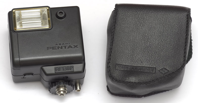 Zum Pentax-Auto-110 System gibt es zwei Blitzgeräte, nämlich das AF130 P und das AF 100P. AF steht nicht für Autofokus, sondern für automatic flash. Leider haben die Kameras keinen normalen Blitzschuh. Einerseits ist es verständlich, weil das Draufsatteln damaliger schwerer und großer Blitzgeräte möglicherweise die mechanische Belastbarkeit der kleinen SLR-Gehäuse überfordert hätte. Andererseits wäre es natürlich schön, wenn man stattdessen einen kleinen, auch anderen Kameras nutzbaren Blitzer verwenden könnte oder heutzutage auch leistungsstarke, leichte und kleine LED-Leuchten. Die waren damals allerdings nicht vorhersehbar.