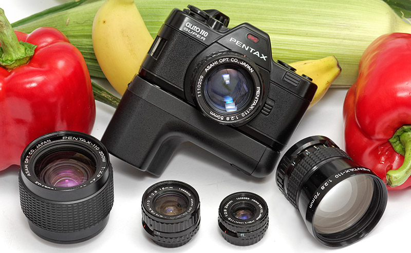 Pentax auto 110 super für Pocketfilm mit Winder und diversen Wechselobjektiven. Größenvergleich mit Obst und Gemüse