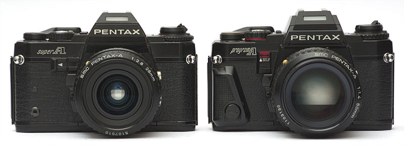 Pentax super A und Pentax program A. Zwei sehr ähnliche Kameras. Die program A wirkt mit ihrem kantigen Prismengehäuse plastikmäßiger und hat als kürzeste Belichtungszeit 1/1000 s, während die super A mit 1/2000 s belichten kann. Beiden haben den gleichen abschraubbaren Handgriff auf der linken Vorderseite. Hier ist die super A ohne ihn dargestellt.