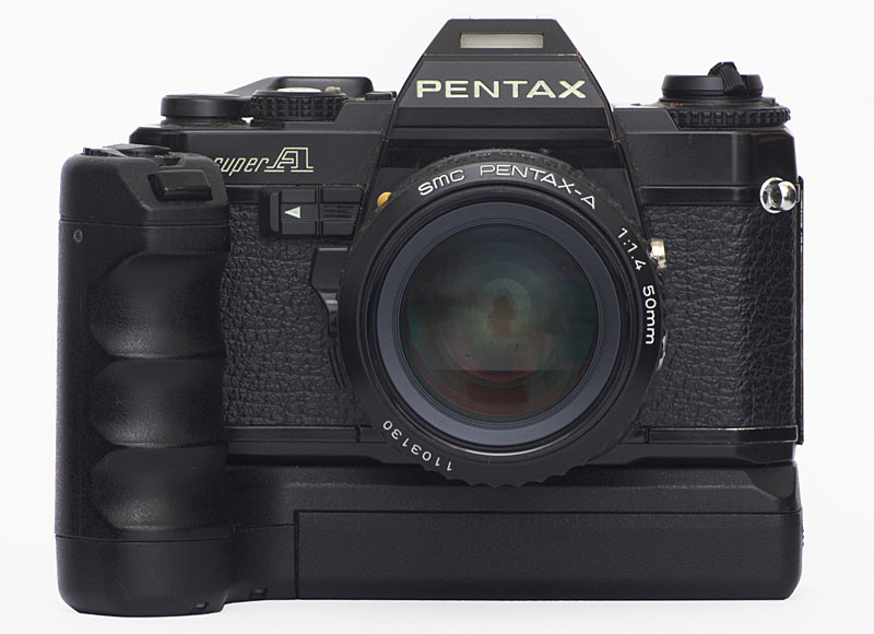 Die Pentax super A ist eine modernisierte Pentax ME Super durch die Ergänzung der TTL-Blitzssteuerung und Blendensteuerung der damals neuen Pentax-A Objektive mit elektrischen Kontakten. Die Pentax super A hat einen guten Ruf und ist begehrt. Noch (2017) gibt es solche Gehäuse für unter 50 €, aber die Tendenz für gut erhaltene Exemplare deutet nach oben.© Thomas Gade