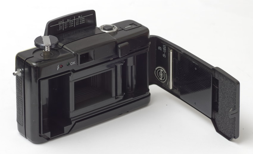Rückseite. Unter ungünstigen Lichtverhältnissen aktiviert die Kamera automatisch das eingebaute Blitzgerät. Für DIN 21 beträgt dessen Reichweite 1,5-3 m, für DIN 24 beträgt sie 2-4,5 m und verlängert sich bei Din 27 auf 3-6 m. Diese Angaben stehen bei hoch geschobener Objektivabdeckung auch auf dem sichtbaren Teil ihrer Rückseite.