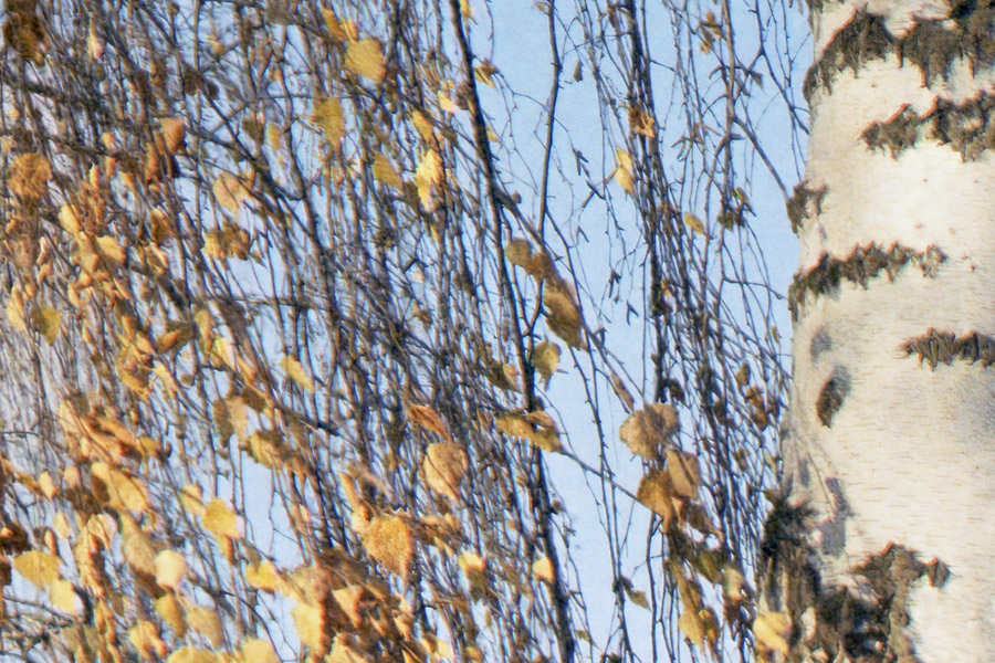 Komplexes Foto mit Objekten in unterschiedlichen Abständen. Fotografiert mit Blende 5.6. Der Autofokus hat auf die herabhängenden Zweige hinter den beiden vorderen Birken scharf gestellt.