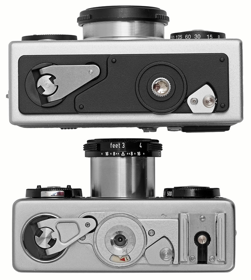 An der Unterseite der alten Rollei 35 befinden sich u.a. ein Zählwerk und ein Blitzschuh mit Mittenkontakt. Die Rollei 35 AF hat keinen Blitzschuh, aber ein eingebautes Blitzgerät. Wichtig: Das Objektiv der Rollei 35 AF ist fest angebaut. Es wird nicht zum Transport in das Kameragehäuse geschoben.