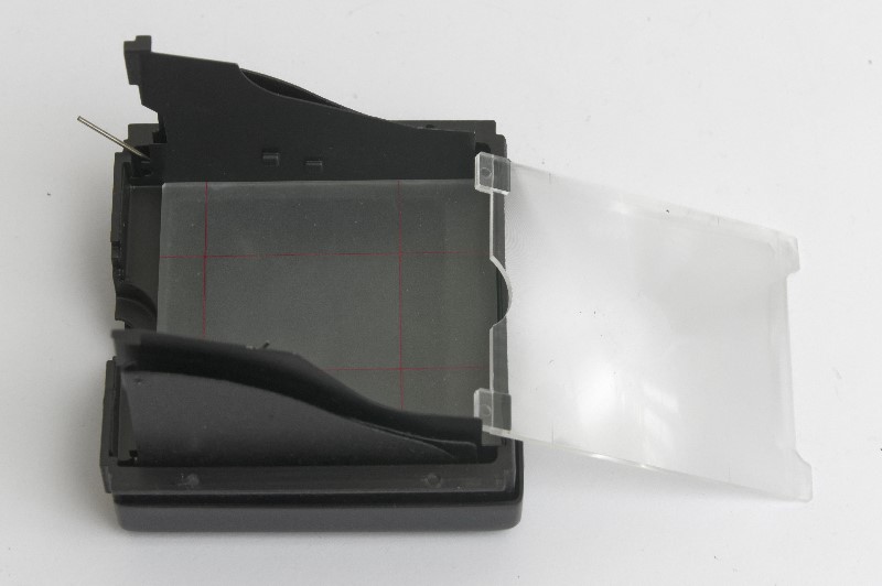 Der Sucher enthält zwei Scheiben, nämlich dicht übereinander eine Fresnelscheibe (innen) und darüber eine Mattscheibe. Das Foto zeigt den Sucher in umgekehrter Stellung. Die Mattscheibe befindet sich in der Halterung des Suchers und die Fresnelscheibe wurde herausgenommen und beiseite gestellt.