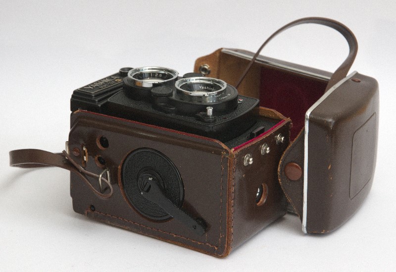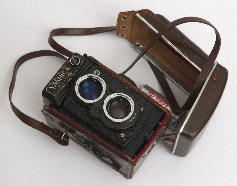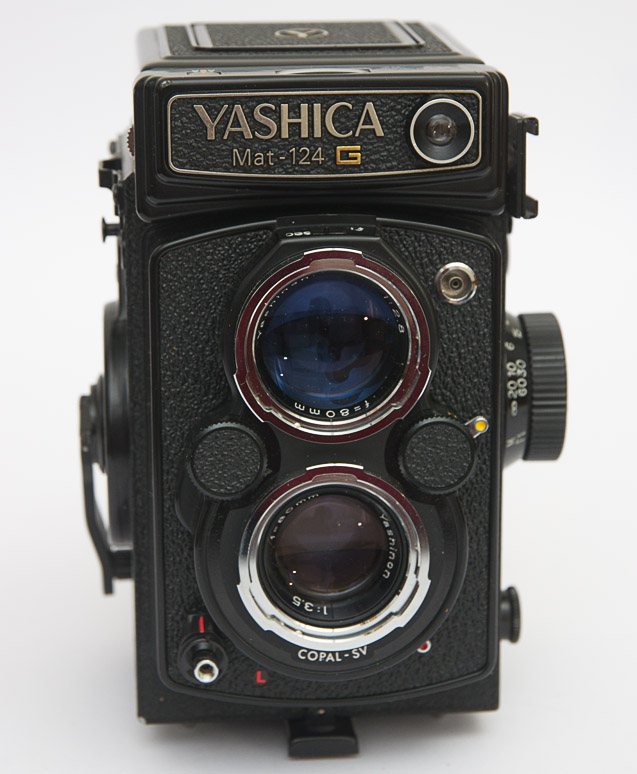 Die aus Japan stammende Yashica MAT-124 G gehört zu den zweiäugigen Spiegelreflexkameras für den 120'er Rollfilm und somit zu den Mittelformatkameras. Dieser Kameratyp hat zwei Objektive, nämlich eines zum Belichten des Films und darüber ein zweites, dessen Bild über einen feststehenden Spiegel auf eine waagerechte darüber liegende Mattscheibe projiziert wird.