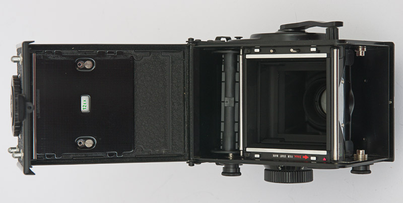 Nach dem Öffnen der rückseitigen Klappe wird die Filmkammer sichtbar. Die Andruckplatte für den Film ist von 12x (120 Rollfilm) auf 24x (220 Rollfilm) umstellbar.