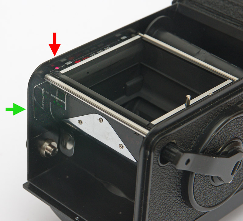 Markierungen für den Pfeil auf der Filmrolle. Bis dahin ist der Film vor dem Schließen der Rückklappe zu spulen. Grün für 120'er Rollfilm und rot für 220'er Rollfilm.