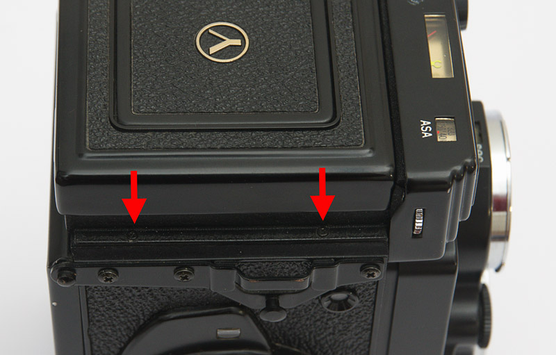 Nach dem Abnehmen des Suchers ist auf der Innenseite des Gehäuses des Belichtungsmessers ein U-förmig aufgeklebter schwarzer Schaumgummistreifen zu sehen, der sich nach mehreren Jahrzehnten in einem Zustand der Auflösung befindet. Im Bild ist dieser Bereich durch rote Balken markiert.