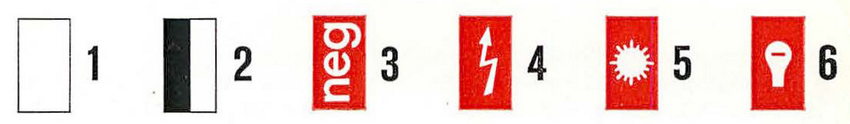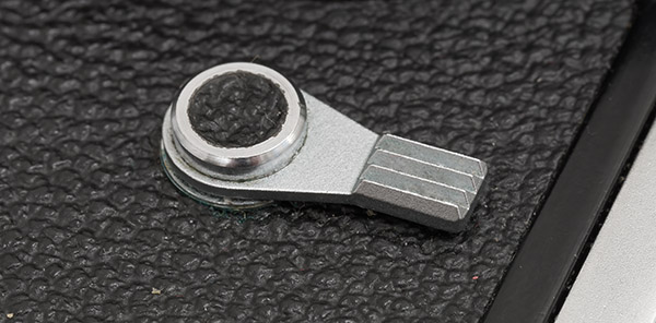 Die Filmmerkscheiben sind nur Gedächtnisstützen und haben keinen Einfluß auf die Funktion der Kamera. Auf der Merkscheibe 12 sind die Filmempfindlichkeit in DIN und ASA aufgetragen. Sie rasten beim Drehen der Scheibe über der Einstellmarke 14 ein. Die unter dem Fenster 21 sichtbare Scheibe enthält Symbole über die Art der verwendeten Filme. Sie wird mit dem Rändelring 20 eingestellt.