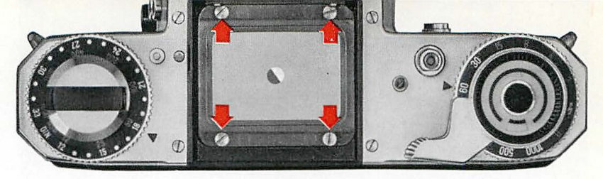 Außerdem gibt es drei austauschbare Sucher, die jeweils oberhalb der Einstellscheibe montiert werden. Sie können durch Druck auf die Taste 15 nach hinten aus ihrer Halterung herausgezogen werden. Beim Einsetzen ist darauf zu achten, daß die Taste 15 hörbar einrastet.
