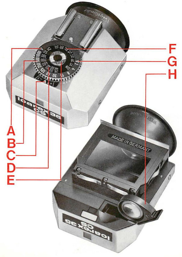 Die an der Kamera gewählte Belichtungszeit wird auch beim Belichtungsmesser eingestellt. Dies erfolgt durch Drehen der Scheibe B bis der entsprechende Wert an der Einstellmarke C einrastet.