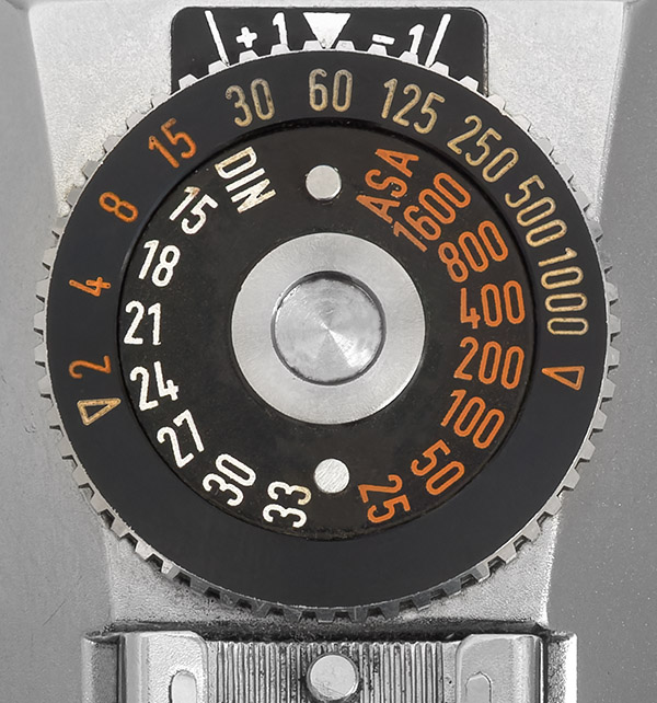 Achtung: Das Einstellen der Empfindlichkeit ist fummelig. Dafür muss die Scheibe B auf 1/60 Sek. eingestellt sein. Durch Druck von oben ist die Scheibe E auszureizen und mittels der beiden Stifte soweit zu verdrehen, bis die richtige Filmempfindlichkeit genau an der Einstellmarke A oder G steht. Sollte die erforderliche Zahl auf der Skala nicht graviert sein, ist ein entsprechender Zwischenwert einzustellen.