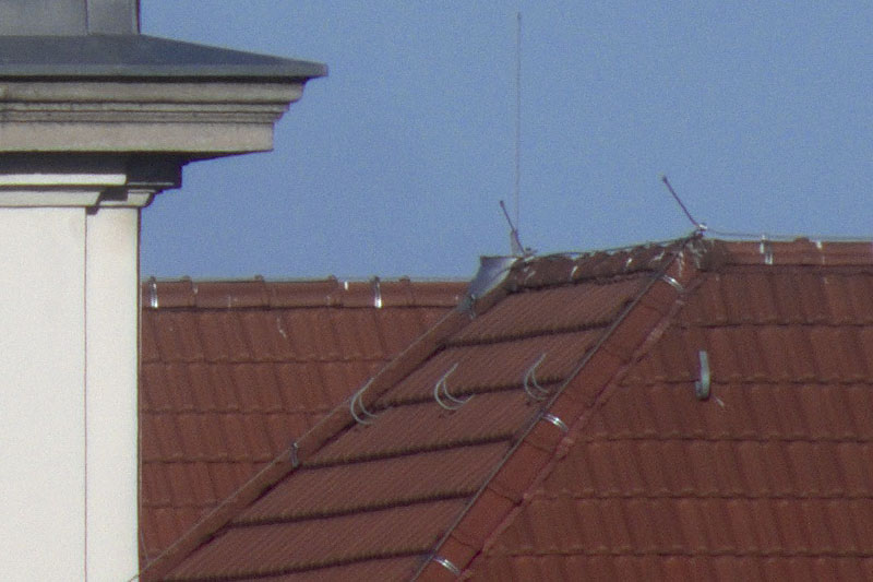 800 x 533 Ausschnitt aus dem Foto. Die Schärfe ist in Ordnung. Ein gelbgrüner Farbstich an der senkrechten Kante der weißen Mauer neben dem Dach wurde digital unterdrückt.