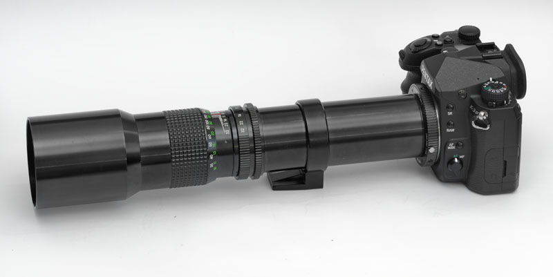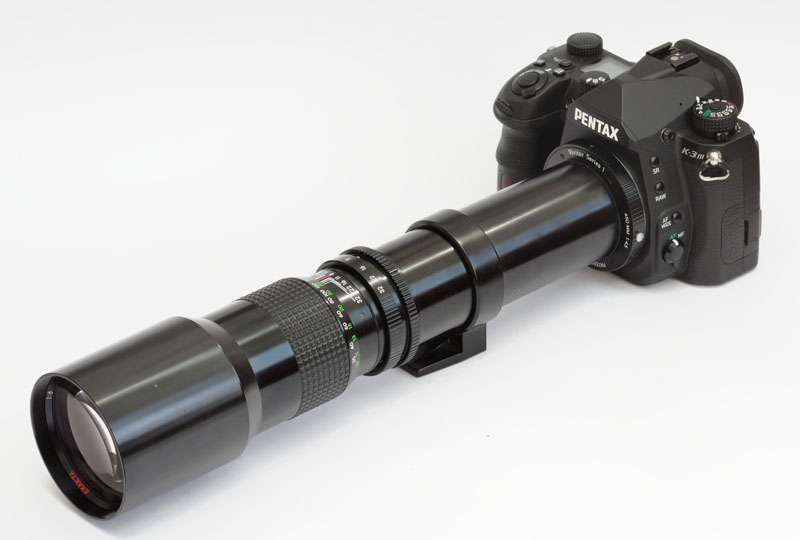 Exakta 500mm F8 Teleobjektiv mit T2 Anschluss an einer Pentax K-3 III DSLR