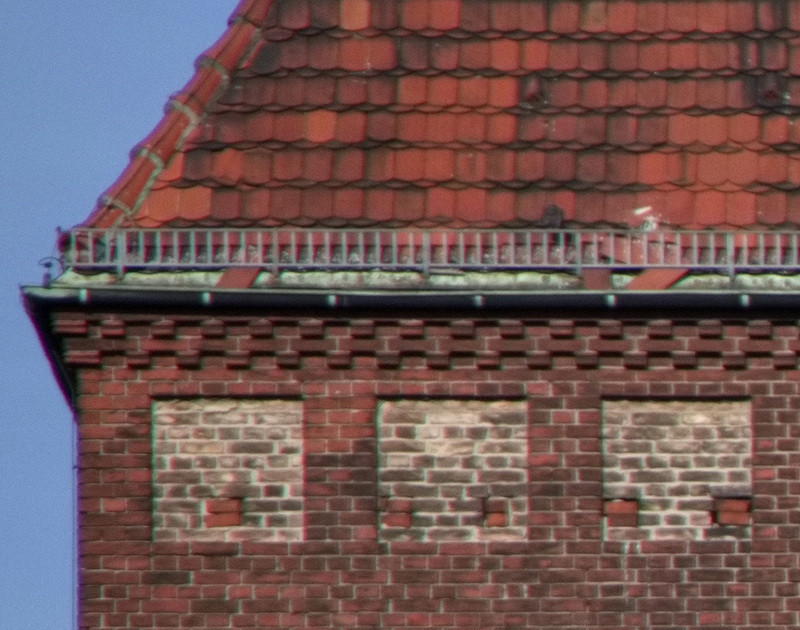 Das Testmotiv enthält viele Linien und geometrische Strukturen, die eine Verzeichnung gut erkennen lassen. Die Kanten am Himmel sind gut geeignet, um Farbsäume zu zeigen. Am Himmel wäre auch Vignettierung gut erkennbar.
