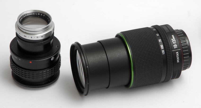 Vergleich des Leitz Wetzlar Elmar 1:4 / 135 mm mit dem Zoomobjektiv smc PENTAX-DA 18-135 mm F3,5-5,6 ED AL [IF] DC WR am APS-C Sensor.