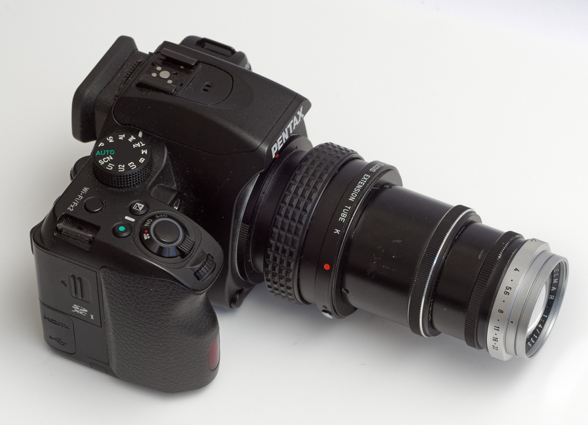Leitz Wetzlar Elmar 1:4 / 135mm an einer Pentax K-70 DSLR. Der richtige Abstand zum Sensor und eine Möglichkeit zum Scharfstellen wurde mit einem Zwischenring (M39), einem M39/Pentax K Adapter und einer Makroschnecke von Pentax realisiert.