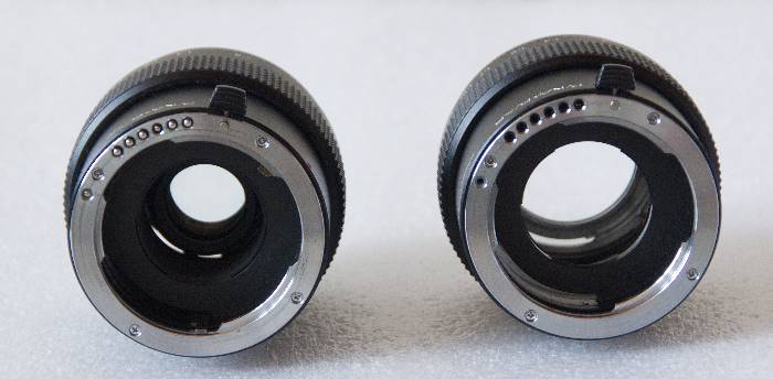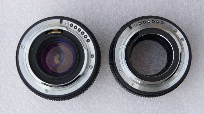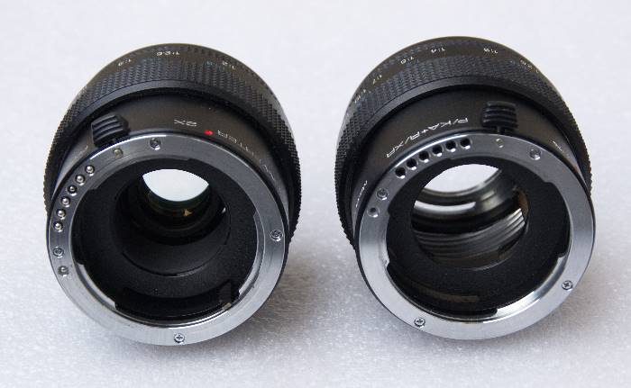 Die folgenden Bilder zeigen links einen unverbastelteten Soligor C/D7 und rechts einen, aus dem die Optik nebst anderen Teilen entfernt wurde. Beide haben Pentax K Anschlüsse. Sinnvoller wäre das M42 Gewinde, das mit diversen Adaptern an Kameras mit unterschiedlichen Anschlüssen montiert werden kann.
