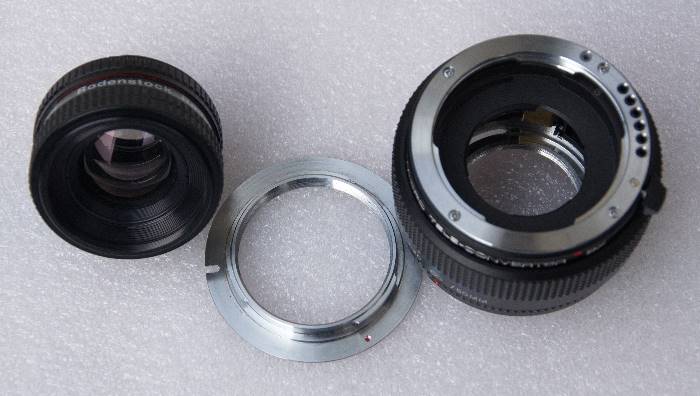 Ein 105mm Vergrößerungsobjektiv von Rodenstock wird mit einem Pentax K Adapter versehen und kann an die Makroschnecke montiert werden. Mit Zwischenringen wird ein günstiger Abstand zwischen Objektiv und Kameragehäuse gewählt. Die Scharfstellung erfolgt mit der Schnecke.