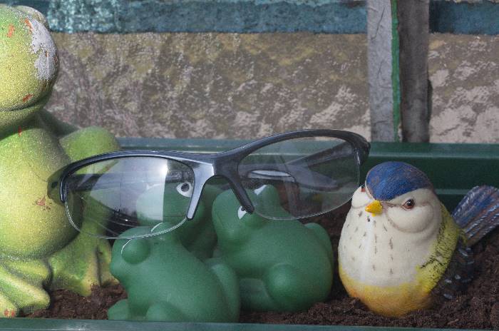 Unser Testmotiv war ein künstlicher Vogel, dessen Größe durch die danebenliegende Brille deutlich wird. Er ist ca. 7,5 cm hoch.