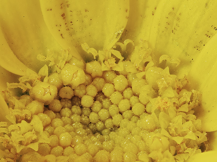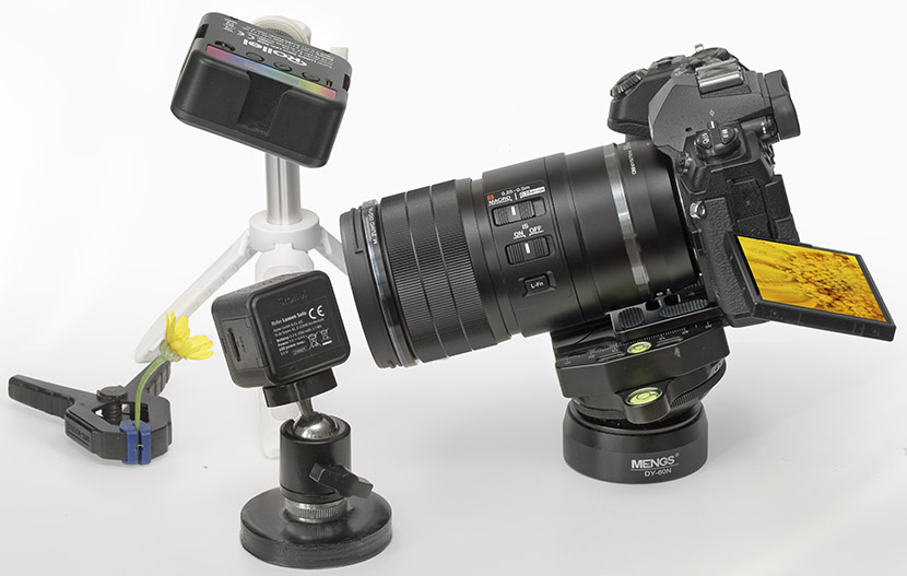 M.Zuiko Digital ED 90mm F3.5 Macro IS PRO an einer Olympus OM-D E-M1 III beim Fotografieren einer kleinen gelben Blüte. Sie wurde mit Focus Bracketing mit 70 Schritten auf Stufe 1 aufgenommen. Die Bilderserie wurde mit DxO PhotoLab 6 konvertiert und mit Helicon Focus gestackt. Durch das Focus Stacking entsteht ein Foto mit großer Schärfentiefe.