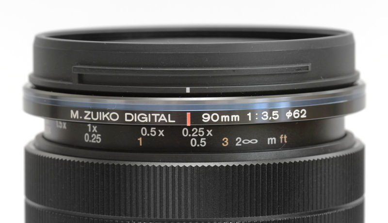 Der Scharfstellring moderner AF-Fotoobjektive ist ein elektronischer Drehring zum Steuern des Autofokusantriebs. Er hat keine Anschläge bei unendlich oder an der Naheinstellgrenze und deshalb auch keine Entfernungsskala. Das ist nicht so angenehm wie konventionelle mechanische Schneckengewinde. Beim M.Zuiko Digital ED 90mm F3.5 Macro IS PRO ist der Scharfstellring aber gleichzeitig auch eine MF-Kupplung, um rasch zwischen AF und MF zu wechseln.Schiebt man ihn ein Stück in Richtung Kameragehäuse, wird der Autofokus deaktiviert und eine Entfernungsskala mit zwei festen Anschlägen an den Enden des Scharfstellenbereichs. Das Feeling beim Fokussieren ist dabei so gut wie bei hochwertigen manuellen Makroobjektiven.
