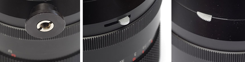 Links: Stativanschluss. Obwohl der Tubus insgesamt recht gut gebaut ist, ist die Basis für die Stativanschluss kaum größer als 1 € Münze. Hier wurde am falschen Ende gespart und wenn man das Objektiv daran auf einen Arka-Swiss-Adapter schraubt, bekommt man es gar nicht so fest, dass es nicht auf dieser Platte dreht, wenn man die Kamera vom Stativkopf auf ein anderes Motiv ausrichten möchte. Nimmt man die größere ¾ Stativschraube und legt ein dünnes Stückchen Gummi (vom Fahrradschlauch) zwischen den Adapter und die Basis, kann man beide so fest miteinander verschrauben, dass es in der Praxis einigermaßen hält. Falls einem das nicht reicht, wird der Adapter nicht nur festgeschraubt, sondern gleichzeitig auch angeklebt.