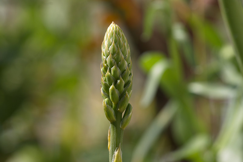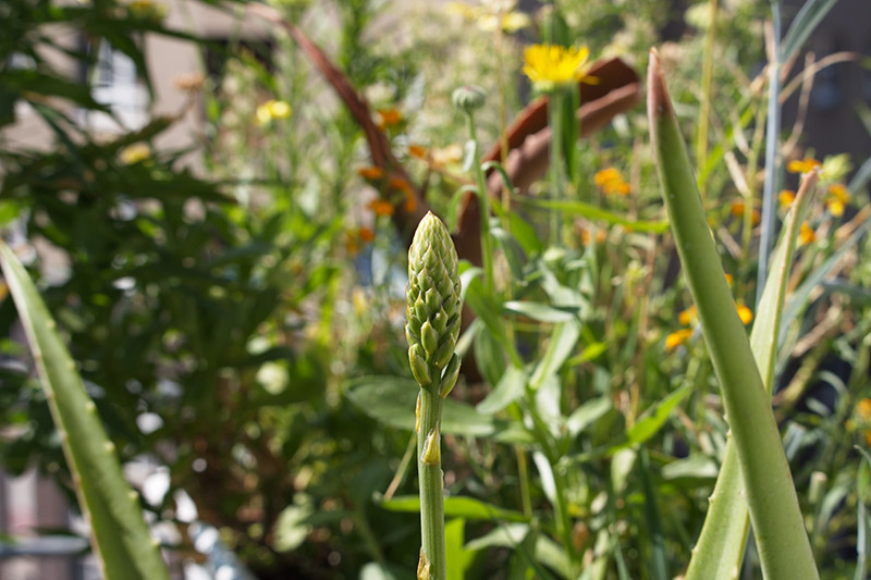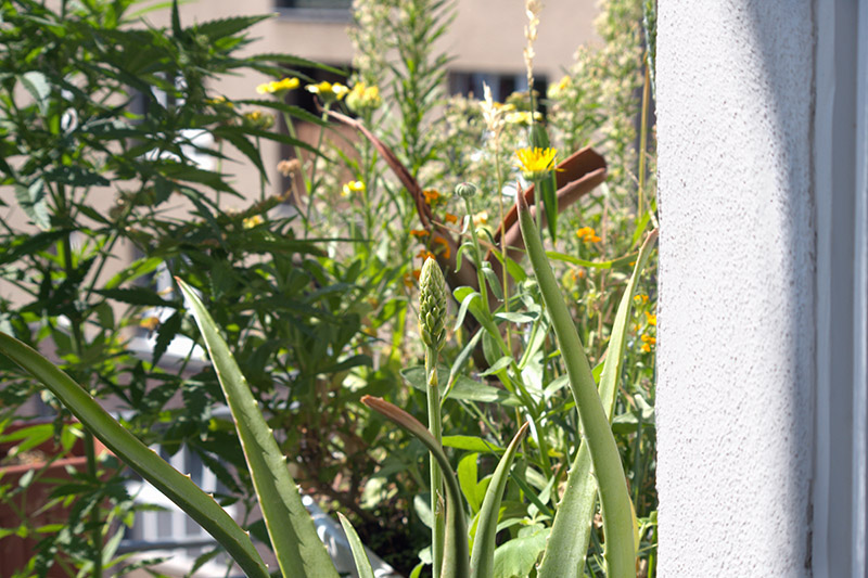 Es wurde eine sich entwickelnde Blüte von einer Aloe Vera Pflanze mit anderen Pflanzen im Hintergrund durch ein geöffnetes Fenster fotografiert. Auf zwei Aufnahmen mit 55 mm Brennweite sieht man rechts ein Stück der Wand neben dem Fenster.