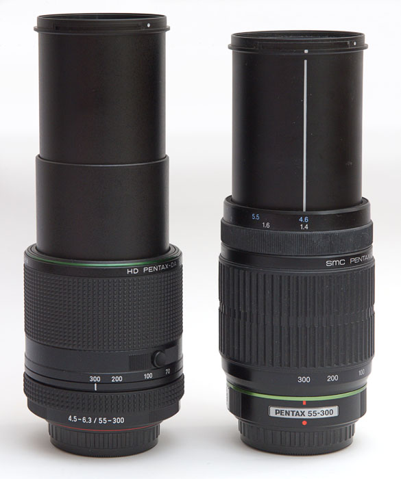 Ricoh wirbt mit einer kompakten Bauweise, doch der Vergleich mit den älteren 55-300mm Pentax Telezooms zeigt keine signifikante Veränderung. Während bei ihnen der teleskopartige Tubus zweigeteilt ist, fahren aus dem PLM 55-300mm zwei ineinandersteckende Tuben heraus. Trotz der Dreiteilung ist das HD / PLM Zoomobjektiv zusammengeschoben etwas länger als die alten Modelle. Aber man kann die Länge verringern, indem der Zoomring über 55 mm hinaus gedreht und verriegelt wird. Der neue Tubus bietet übrigens keine Möglichkeit mehr, eine Stativschelle anzubringen, um eine bessere Balance auf einem Stativkopf zu erhalten. Beim älteren Vergleichsmodell war das am starren Ring vor dem Bajonett möglich.