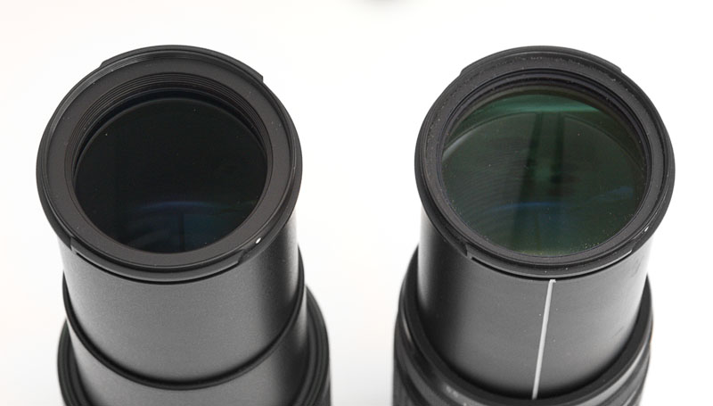 Der Innentubus des HD / PLM Modells ist besser geschwärzt als bei der älteren Version. Auch ist die neue Vergütung wirksamer; das Glas spiegelt weniger. Die folgenden optischen Vergleiche zeigen, dass die Bilder des HD / PLM Modells kontrastreicher sind. Das dürfte diesen Verbesserungen zu verdanken sein.