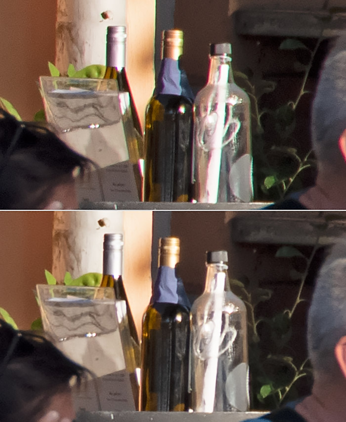 Oben: Farbsäume an einigen Kanten. Unten: Nach automatischer Korrektur der chromatischen Aberrationen durch Adobe Camera Raw.