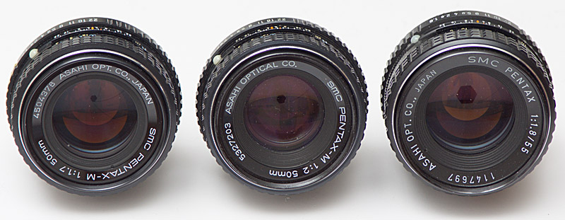 Von links nach rechts: SMC Pentax-M 1:1.7 50mm, SMC Pentax-M 1:2 50mm, SMC Pentax 1:1.8/55