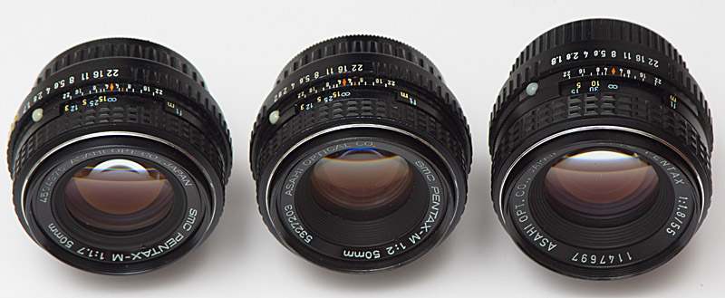 | SMC Pentax 1:1.8/55 | SMC Pentax-M 1:2 50mm | SMC Pentax-M 1:1.7 50mm |