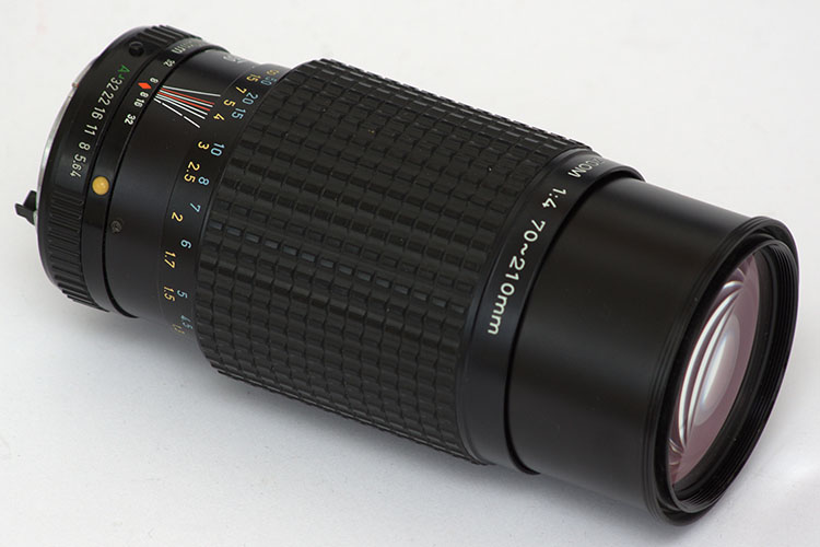 Das smc Pentax-A Zoom 1:4 70-210mm aus den 1980er ist ein sogenanntes One-touch Zoom, weil man mit einem Ring sowohl die Brennweite verstellt als auch die Schärfe einstellt. Diesen Objektivtyp nennt man auch Schiebezoom. Es hat ein Pentax KA-Bajonett und ermöglicht die Steuerung der Blende durch die Kamera. Scharf gestellt wird manuell; einen Autofokus gibt es nicht. Das Telezoomobjektiv hat eine einschiebbare Sonnenblende, die bei Bedarf herausgezogen wird. Pentax hatte mehrere Pentax-M und Pentax-A Objektive mit solchen Sonnenblenden produziert. Leider werden neue Objektive nicht mehr damit gebaut.