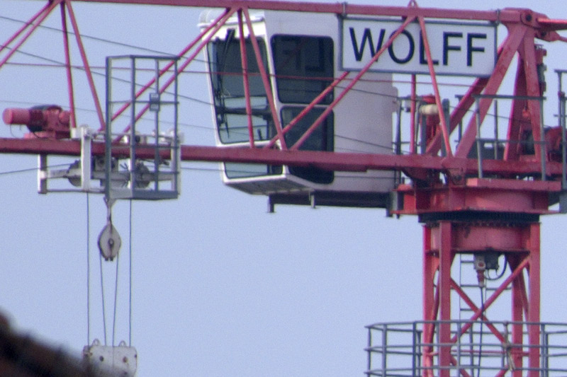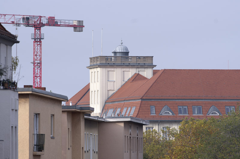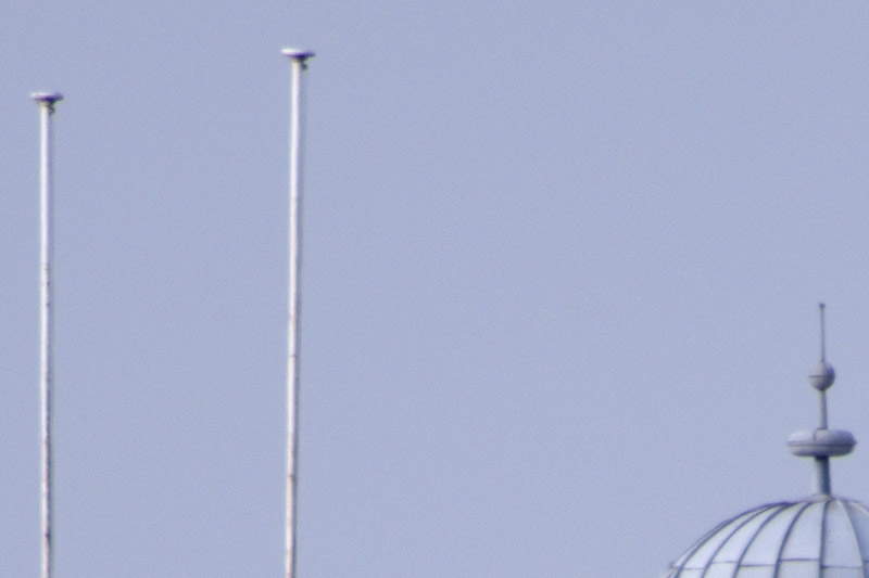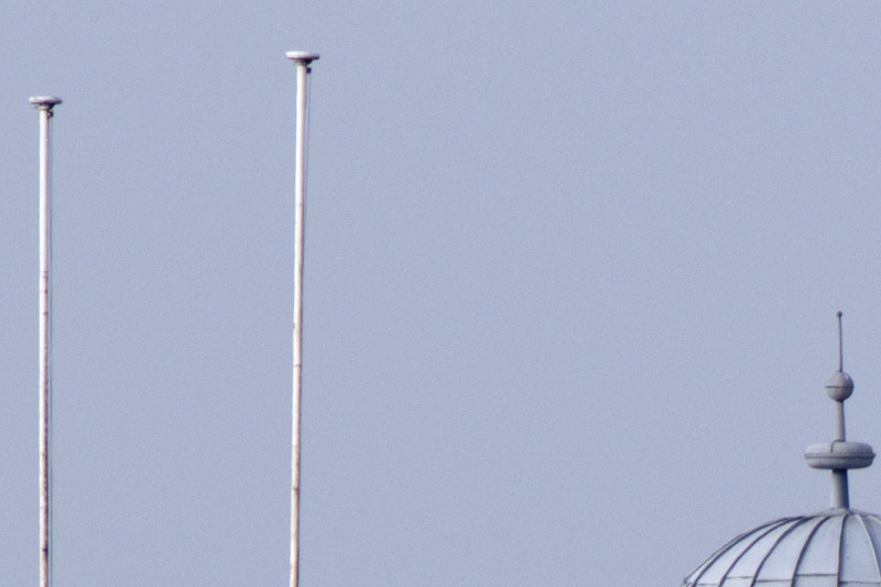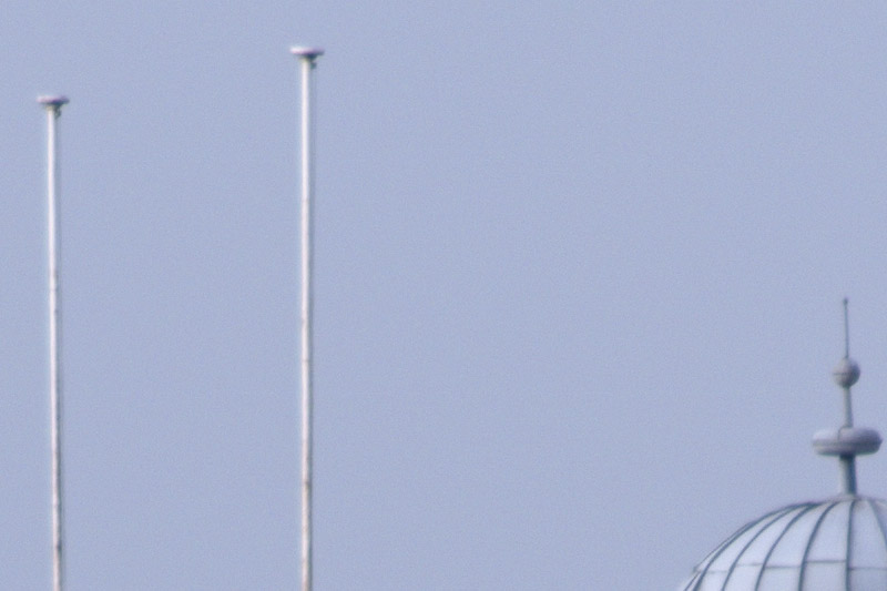 Zum Vergleich langer Brennweiten fotografiere ich von meinem Balkon ein ca. 600 Meter entferntes Hausdach mit zwei Fahnenmasten und einer Kuppel. Siehe: Teleobjektive - Vergleich