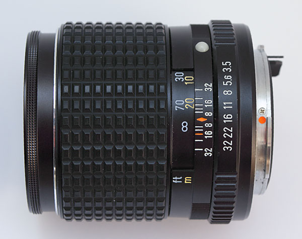 Das Objektiv aus der Zeit vor dem Autofokus hat eine Scharfstellung, die man an modernen Objektiven nur noch selten findet. Der breite Scharfstellring läßt sich gut und mit einem angenehmen Wiederstand drehen. Zu besseren Kontrolle sollte man am Okular der Pentax DSLR eine Okularlupe verwenden. Pentax bietet die O-ME53 Sucherlupe mit 1,2x Vergrößerung an, die das Sucherbild deutlich vergrößert.