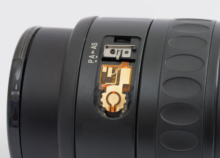 Bei gebrauchten Power Zoom Objektiven ist das Plastikstück mit dem Schiebeschalter oft nicht mehr vorhanden. Da er keine erkennbare Wirkung hat, ist der Verlust nicht kritisch. Aber der kosmetische Mangel macht das Objektiv finanziell nahezu wertlos. Am besten verdeckt man die Stelle mit scharzem Klebeband.