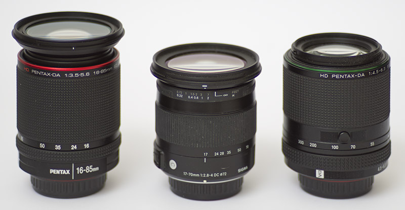 Größenvergleich. Pentax-DA 16-85mm (links) Sigma 17-70mm 2.8-4 (mitte) HD Pentax-DA 55-300mm PLM (rechts)