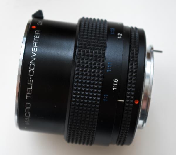 Thomas Gade - Juli 2010Der C/D 7 Macro Teleconverter 2x wurde baugleich unter anderem von Vivitar, Soligor und Kenko angeboten. Er verdoppelt die Brennweite und hat eine eingebaute Makroschnecke mit einem Hub von ca. 16mm, der den Nahbereich der Aufnahmeoptik enorm erweitert. Das geniale Gerät ist zugleich ein variabler Zwischenring und Telekonverter. Ein 50mm Objektiv, das auf 0,45m Entfernung scharfgestellt ist, erreicht mit diesem Telekonverter einen Maßstab von 1:1. In der Unendlich-Einstellung schafft das 50mm Objektiv bei voll ausgedrehtem Makroring des Telekonverters 1:1,5!
