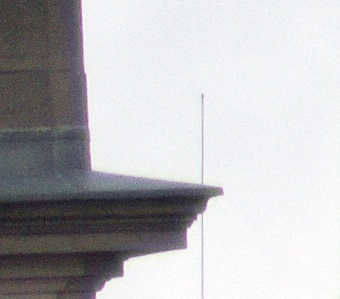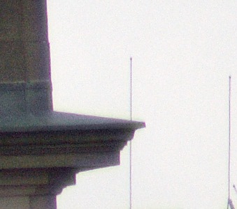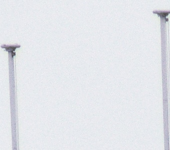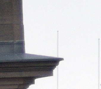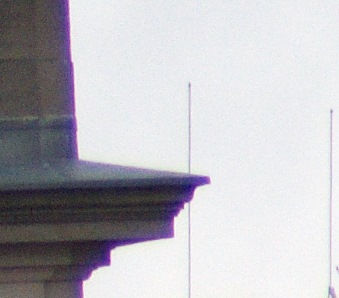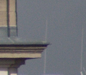 Die nachstehenden Ausschnitte stammen aus zwei Bildern, die kurz nacheinander unter anderen Lichtbedingungen entstanden sind. Beim ersten Bild war es total bewölkt, beim zweiten Bild schien die Sonne auf das Gebäude, während der Himmel im Hintergrund noch bewölkt war. Bei beiden Fotos wurden mit dem Programm Bibble Pro 5 beim Wandel vom pentaxeigenen RAW-Format (PEF) zum Tiff die blauen Säume unterdrückt.