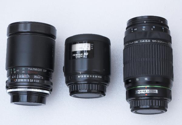 Größenvergleich: links: Tamron SP 35-105mm mitte: Pentax Macro 2,8/50mm rechts: Pentax 55-200mm