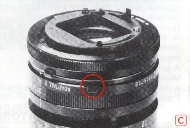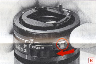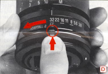 D. Für Kameras mit Programm-, Blenden- und Zeitautomatik wird der Blendenring am Objektiv auf AE (sofern vorhanden) bei der kleinsten Blende eingestellt. Dabei wird der Sperrknopf am Adaptall-Adapter gedrückt, damit AE wählbar ist. Der Sperrknopf ist auch zu drücken, wenn statt mittels AE die Blende am Objektiv manuell eingestellt werden soll.